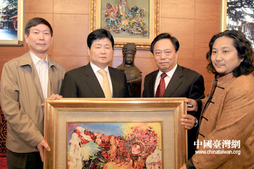 中國臺(tái)灣網(wǎng)2月2日臺(tái)中消息 2日,中華全國臺(tái)灣同胞聯(lián)誼會(huì)會(huì)長梁國揚(yáng)一行,前往臺(tái)中縣拜會(huì)了大甲鎮(zhèn)瀾宮董事長顏清標(biāo),并向顏清標(biāo)贈(zèng)送國粹油畫精品《貴妃醉酒》的繡品。 (中國臺(tái)灣網(wǎng) 田云鵬 攝)