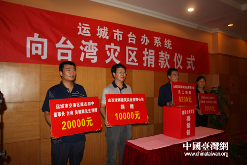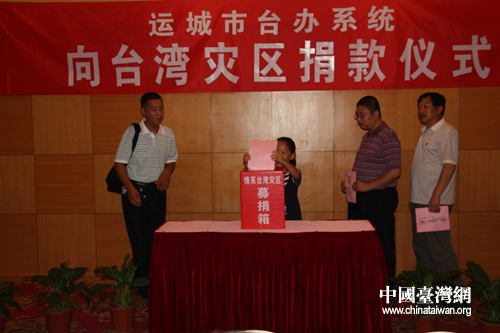 運(yùn)城市臺(tái)辦主任董澤民在捐款活動(dòng)上表示,自從8月8日臺(tái)風(fēng)“莫拉克”侵襲臺(tái)灣中南部地區(qū)以來,運(yùn)城市各界群眾紛紛通過電話、書信等方式向臺(tái)辦部門了解受災(zāi)地區(qū)情況,咨詢捐款事宜。今天借此機(jī)會(huì)我們帶來了全市人民的愛心、誠(chéng)心,希望通過大家的共同努力幫助災(zāi)區(qū)同胞渡過難關(guān)。