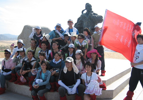 同學們在大詩人王維雕像下儼然變成了沙漠王子和公主。(圖片來源:寧夏臺辦)