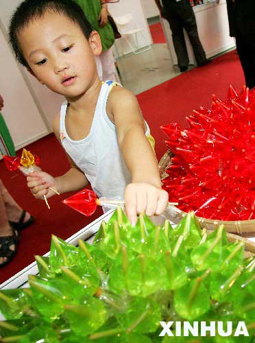 7月20日,一位小朋友正在選購由麥芽糖制成的糖果。當(dāng)日,“2007臺(tái)灣優(yōu)質(zhì)農(nóng)產(chǎn)品巡回展覽”在上海農(nóng)業(yè)展覽館開展,來自臺(tái)灣島內(nèi)各級農(nóng)會(huì)、專業(yè)協(xié)會(huì)及農(nóng)業(yè)企業(yè)等150家單位為本次展覽帶來了20余種時(shí)令水果、蔬菜和469種農(nóng)產(chǎn)品深加工品。此后,巡回展還將在南京、福州、武漢、廣州、大連五個(gè)城市陸續(xù)展開。 新華社記者 裴鑫 攝