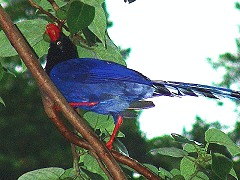 “臺(tái)灣藍(lán)鵲”為臺(tái)灣地區(qū)特有,與烏鴉同屬鴉科,叫聲同樣沙啞,羽色卻與烏鴉迥然不同,亮麗無比。頭、臉、頸、喉、胸都是黑色,黃色的眼珠包圍黑色的瞳孔,鮮紅色的鳥喙、雙腳,身體上半部可目視處及下半部的腹部呈鮮藍(lán)色,尾下覆羽則為白色,有十二根尾羽,最長(zhǎng)二羽為藍(lán)根白尾,其于為黑根白尾,左右對(duì)稱。尾羽長(zhǎng)占了總體長(zhǎng)的三分之二,飛行時(shí)總以直線前進(jìn),非常優(yōu)雅高貴。