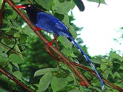 一襲亮藍(lán)的羽絨,橙紅的嘴喙,拖曳著長(zhǎng)長(zhǎng)的尾羽,跳躍飛翔在山林間,像極了身著藍(lán)旗袍,抿著朱紅的曼妙女子輕盈的手舞足蹈。沒錯(cuò)!這就是俗稱“長(zhǎng)尾山娘”的“臺(tái)灣藍(lán)鵲”。
