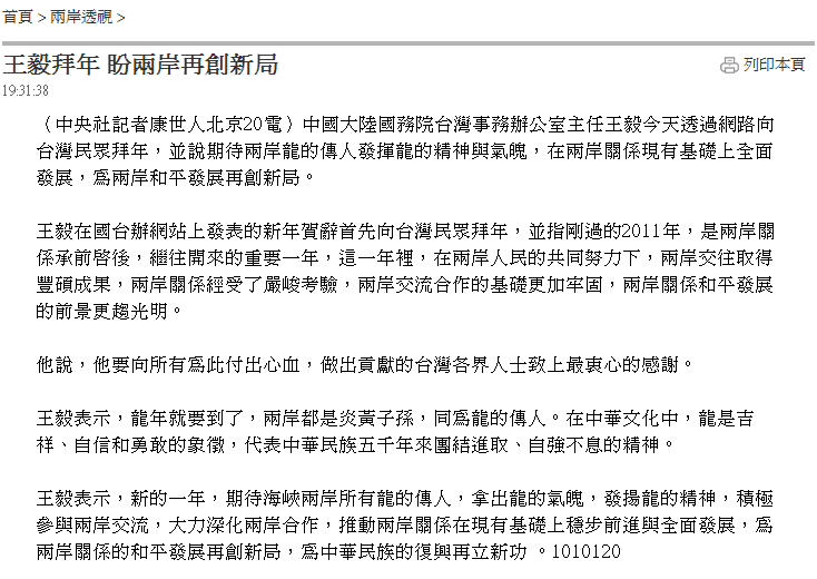 王毅在國臺(tái)辦網(wǎng)站上發(fā)表的新年賀辭首先向臺(tái)灣民眾拜年,並指剛過的2011年,是兩岸關(guān)係承前啟後,繼往開來的重要一年,這一年裏,在兩岸人民的共同努力下,兩岸交往取得豐碩成果,兩岸關(guān)係經(jīng)受了嚴(yán)峻考驗(yàn),兩岸交流合作的基礎(chǔ)更加牢固,兩岸關(guān)係和平發(fā)展的前景更趨光明。