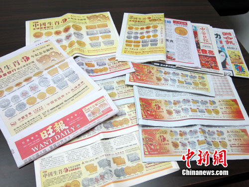 中華錢幣文化是中國文化的一個(gè)組成部分,生肖文化更為中華民族所獨(dú)有,龍年春節(jié)將至,圖為臺(tái)灣大洋金幣公司在臺(tái)灣《聯(lián)合報(bào)》、《旺報(bào)》、《中華日?qǐng)?bào)》等報(bào)刊推介中國人民銀行發(fā)行的壬辰龍年生肖金銀紀(jì)念幣。