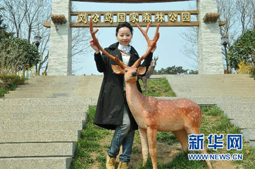 4月14日,一位媒體記者在劉公島國家森林公園門前與梅花鹿雕塑合影。 臺灣梅花鹿“繁星”“點點”和長鬃山羊“喜羊羊”“樂羊羊”將于4月16日正式入住威海劉公島國家森林公園。 新華社記者 鄧衛(wèi)華 攝