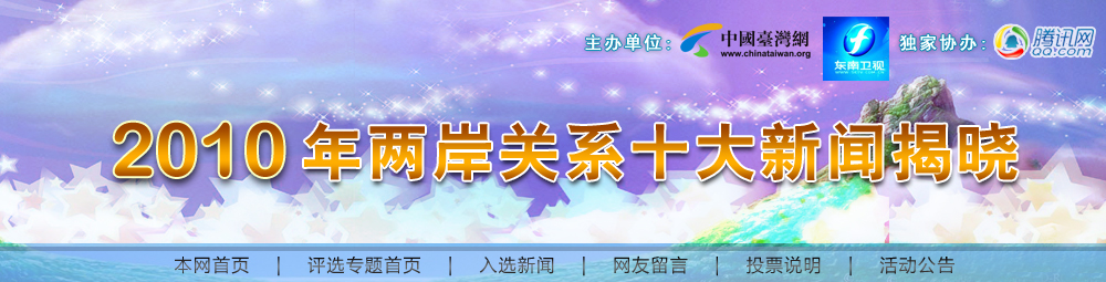 | 我網(wǎng)自2005年推出“兩岸關(guān)系十大新聞評(píng)選”,至今已經(jīng)連續(xù)舉辦過5屆。每一年我們都同專家學(xué)者與廣大關(guān)注兩岸關(guān)系發(fā)展的網(wǎng)友一道,評(píng)選出當(dāng)年最具影響力的兩岸關(guān)系十大新聞事件。同時(shí),也以此為線索回顧與梳理... |