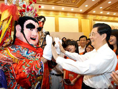 | 7月12日,中共中央總書記胡錦濤在北京人民大會堂參加兩岸萬名青年大交流主題聯(lián)歡活動,與兩岸青年朋友共同領(lǐng)略中華傳統(tǒng)文化魅力,共同展望兩岸關(guān)系和平發(fā)展前景。 |
