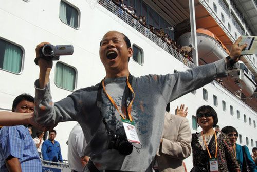3月16日,由港中旅集團(tuán)組織的“安利心印寶島萬人行”首發(fā)團(tuán)1600人,乘坐“海洋神話號(hào)”豪華郵輪抵達(dá)臺(tái)灣基隆港,這是自去年7月大陸居民赴臺(tái)旅游實(shí)施以來規(guī)模最大、人數(shù)最多的旅游團(tuán),也是兩岸“三通”基本實(shí)現(xiàn)以來第一個(gè)郵輪直航團(tuán)。新華社記者 王妍 攝