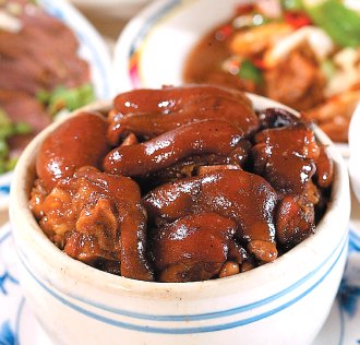以小盅盛裝的“蹄花黃豆”得花上兩天工夫,燒出紅潤飽滿的色澤,黃豆調(diào)和了豬腳的油膩感。一甕約兩人分,不過有趣的是,甕過完年則要還給老板。
