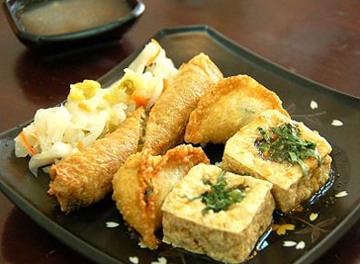炸的金黃酥脆的餃子皮,里頭是臭豆腐內(nèi)餡,咬一口,香味混和著臭豆腐的獨(dú)特味道,讓味蕾活了起來(lái),也難怪光是用看的就讓人口水直流。顧客:“臭臭,又香香的!鳖櫩停骸敖(jīng)過(guò)油炸,香又脆,口感順順的。”