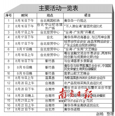 ●2010年8月16日,廣東省省長黃華華帶隊(duì)赴臺(tái)灣舉行“臺(tái)灣·廣東周”活動(dòng);顒(dòng)主題為“合作之旅、鄉(xiāng)情之旅”,內(nèi)容包括經(jīng)貿(mào)合作、商品采購、旅游合作、農(nóng)業(yè)合作、文化交流、宣傳亞運(yùn)等,當(dāng)日還將舉行“萬人游臺(tái)灣”首團(tuán)啟動(dòng)儀式!(記者 陶達(dá)嬪 鄧紅輝)