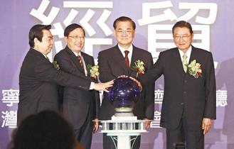 遼臺(tái)經(jīng)貿(mào)論壇昨在君悅飯店舉行,陳政高(左二)、邴志剛(左一)、連戰(zhàn)(右二)、江丙坤(右一)共同主持開(kāi)幕。記者陳柏亨/攝影(臺(tái)《聯(lián)合報(bào)》)