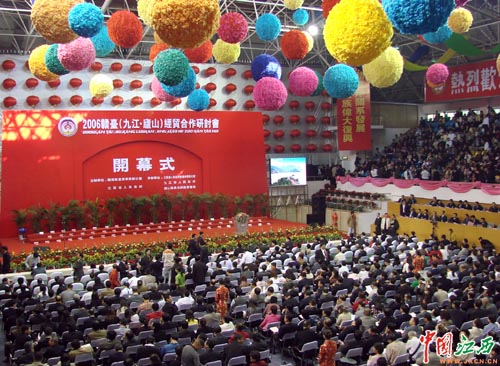 9月23日,2006贛臺(tái)(九江·廬山)經(jīng)貿(mào)合作研討會(huì)開(kāi)幕,1700多名臺(tái)灣知名人士、臺(tái)灣工商企業(yè)界人士參加了研討會(huì)。(楊冗晟 攝)
