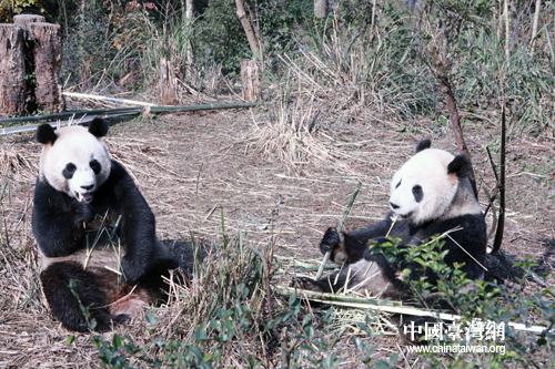 在地震中機敏逃生后的大熊貓“團團”和“圓圓”,現(xiàn)住在四川雅安碧峰峽大熊貓飼養(yǎng)基地,兩岸媒體到達時,它們正在開心進食。
