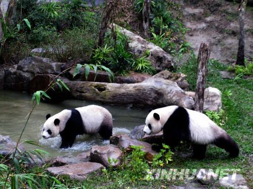 2月14日,“團團”“圓圓”在戶外游玩。 當日,贈臺大熊貓“團團”“圓圓”首次戶外公開亮相!皥F團”“圓圓”于2008年12月來到臺北市立動物園,并在2009年1月26日正式與臺灣民眾見面。 新華社記者 王妍攝