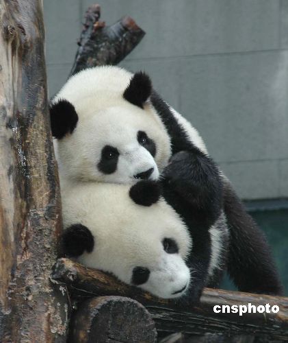 資料圖:親密無間、如膠似漆的贈臺大熊貓“團團”、“圓圓”。