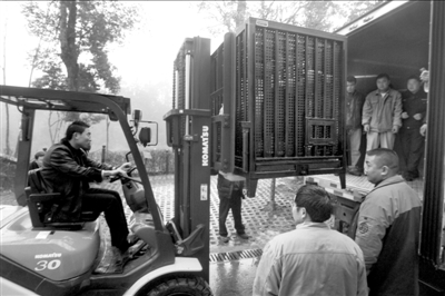 工作人員利用叉車將“圓圓”平穩(wěn)送進專門設計的轉(zhuǎn)運車。王磊攝(圖片來源:京華時報)