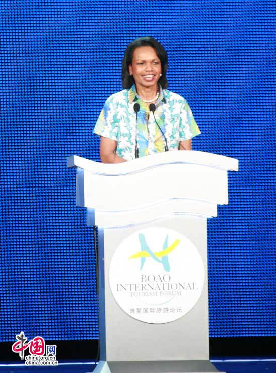 賴斯非常感謝博鰲國際旅游論壇給她這樣一個機(jī)會講話,她說,我在這里看到了很多老朋友,很高興在這里能和他們再續(xù)友誼。