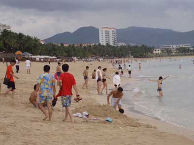 面對謠言,三亞市民、游客不屑一顧。圖為大東海依然游人如織