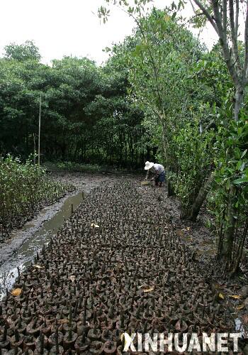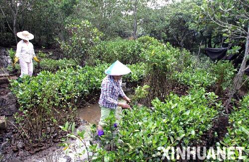 海南省海口市東寨港紅樹林國家級自然保護區(qū)的工作人員在培育紅樹林幼苗。 新華社記者丁林攝