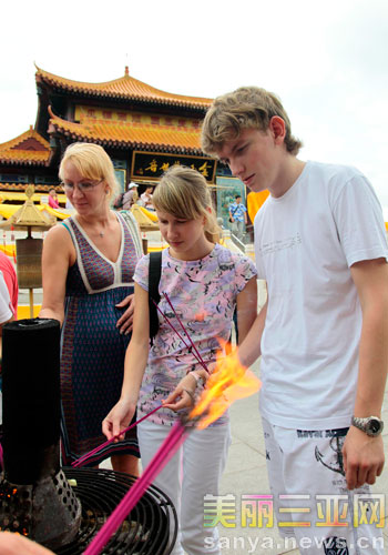 俄羅斯游客逛南山時,入鄉(xiāng)隨俗燒香拜佛。陳文武 攝
