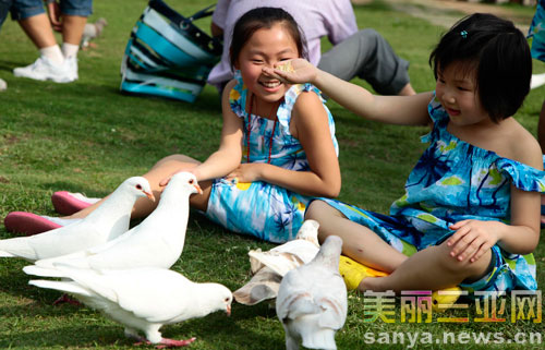 兩名小朋友在南山與鴿同樂,享受新年的快樂時光。陳文武 攝