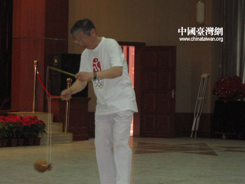中國(guó)臺(tái)灣網(wǎng)7月13日北京消息 今天上午,臺(tái)灣鶯歌高職扯鈴隊(duì)參觀了北京市豐臺(tái)二中,并與二中的學(xué)生,分別進(jìn)行了抖空竹表演。在演出現(xiàn)場(chǎng),本網(wǎng)記者就兩岸空竹藝術(shù)的發(fā)展特色專訪了北京玩具協(xié)會(huì)空竹委員會(huì)副主任劉振鈺老先生。