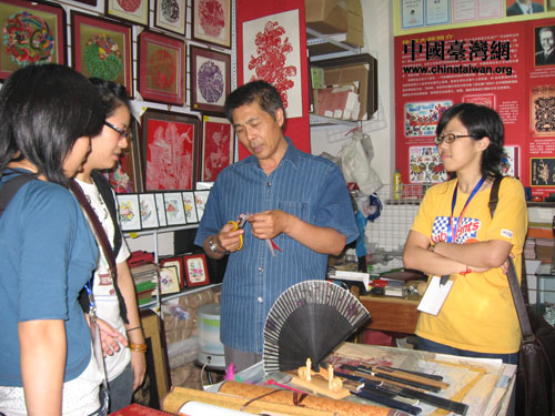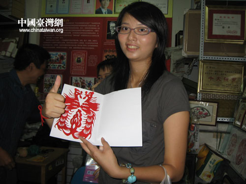 在剪紙坊,許多臺灣的女學生對這門細致而精巧的藝術贊嘆不已,拿起工作間展出的剪紙作品左看右看,愛不釋手。最后,幾個學生還要求師傅現場為她們剪了一對鳳凰。師傅一邊和學生們聊天,一邊動手剪紙,臺灣學生連忙請師傅專心剪紙,害怕自己的鳳凰被剪壞。師傅笑著說:放心吧,沒問題。最后,看到一對展翅欲飛的鳳凰完好地展現在自己面前,臺灣學生嘖嘖稱奇,連忙購買收藏。