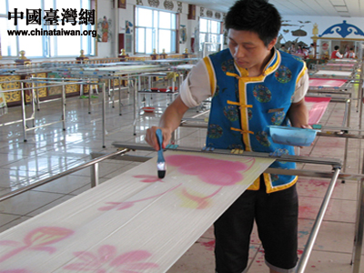 中國(guó)臺(tái)灣網(wǎng)7月23日包頭消息 “原來(lái)漂亮的披肩就是這樣制作的!弊蛱煜挛,兩岸記者在包頭見(jiàn)識(shí)到了羊絨手繪披肩的全部制作過(guò)程。(張弛 攝)