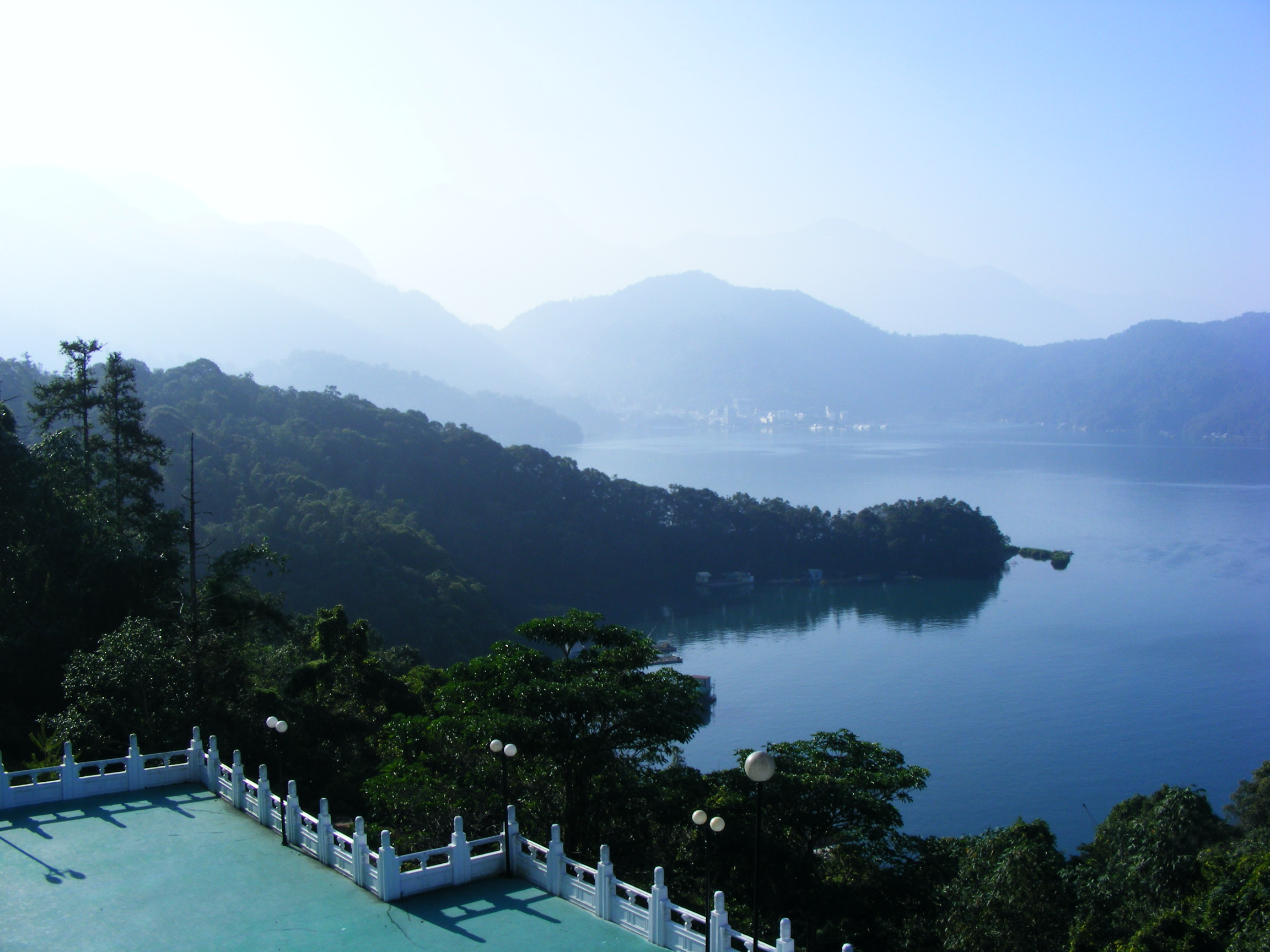 行程并沒有因為天氣而改變,旅行大巴在7時30分準時從賓館出發(fā)了。當大巴行駛了20多分鐘后,一縷透過車窗射在臉上的陽光帶給我莫大的驚喜。果然,南投逐漸開始撥云見日了。當我們抵達日月潭時,大霧已經散去,惟有一層輕輕的薄霧在撫摸著日月潭平靜的水面。當太陽逐漸升起,輕霧也柔柔地散去,日月潭從迷離到透明,將兩種同樣動人心魄的美展示得淋漓盡致。