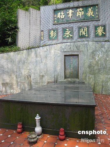 昔日上海灘大亨杜月笙之墓位于臺北縣汐止“秀峰國小”后山。蔣中正題“義節(jié)秉昭”、張群題“譽聞永彰”金色挽額,作為背景映襯灰黑色的墓碑。墓碑上刻有宋體楷書金字“先考杜公月笙府君之墓”。據(jù)記載,杜月笙一九五一年逝世于香港,一九五三年安葬于臺灣。 中新社發(fā) 許曉青
