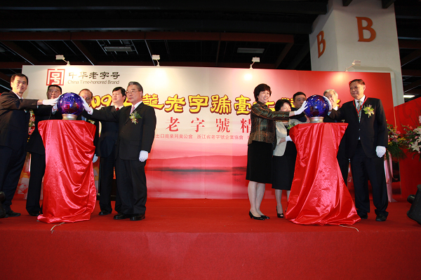 臺灣主持人首先向大家介紹參加這次開幕式的兩岸貴賓。然后,請臺北市進出口商業(yè)同業(yè)工會理事長許勝雄、國民黨副主席林豐正、浙江省老字號企業(yè)協(xié)會會長馮根生、浙江省經(jīng)濟貿(mào)易委員會主任湯黎路等主要貴賓上臺致詞。在浙臺主要貴賓共同啟動魔球中老字號精品展正式開始。