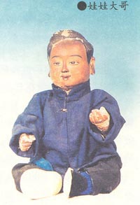 當(dāng)時拴娃娃有兩種形式:一是較富裕的人家的婦女多由道士陪伴,在眾多的泥娃娃中選一個拴回家,同時留下為數(shù)可觀的香資。二是生活較貧窮的人家則要背著道士悄悄地偷一個揣在懷里帶回家。有錢也好,無錢也罷,道士只是睜一眼閉一眼。因此,這種風(fēng)俗也叫“偷娃娃”。無論采取哪一種方式,人們在拴娃娃時都要默念提前為娃娃起的乳名,說:“XX,跟媽媽(或者是奶奶、姥姥)回家吧!”帶回家后將小泥娃娃放在臥室內(nèi)炕角邊0,不能壓著、磕著、碰著,也不能晾著,要用紅布蓋好。一旦婦女懷孕生下孩子后,方可將小泥娃娃拿出來,先得去天后宮還愿,即事先要在洗娃娃莊塑九十九個同樣大小的小泥娃娃送還給送子娘娘像前,然后將自己拴走的小泥娃娃重新加泥塑成更大一些的,帶回家中并在神佛龕旁邊供養(yǎng)起來,將其視為自己的長子,而自己親生的兒女則要排行老二。因此泥娃娃也稱“娃娃大哥”或“娃娃哥”。每天吃飯時,做家長的還要在娃娃大哥的像前放置食物碗筷,年節(jié)時還要為其添置新衣服。而且每年還再到洗娃娃莊去“洗”一次娃娃,即為塑像重新加大,視為長了一歲。年復(fù)一年,娃娃大哥的形象從穿兜兜的小兒一直要“長”到留胡須的老者。與此同時,隨著其真弟妹的長大,成家立業(yè),生兒育女,娃娃大哥的輩份也隨之增長,由娃娃大哥升為娃娃大爺、娃娃大舅、娃娃爺爺、直至太爺……倘若父母相繼亡故,娃娃大哥要由真弟弟一代一代地傳下去,永遠(yuǎn)供養(yǎng)著,因為人們認(rèn)為所有的子孩都是由“他”帶來的。