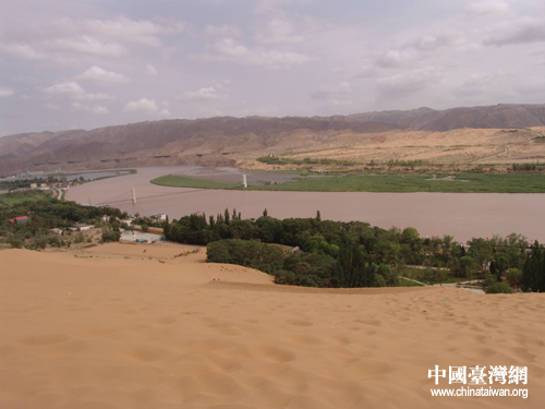 7月10日,在寧夏參加“海峽兩岸記者聯(lián)合采訪活動”的兩岸記者一行參觀游覽沙坡頭旅游區(qū)治沙工程。圖為記者乘羊皮筏在黃河漂流。