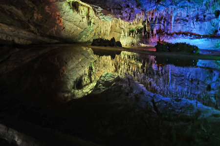 水洞“小三峽”兩岸奇峰聳峙,怪石猙獰,河水夏日冰冷徹骨;干洞和迷津洞內(nèi)鐘乳石保存完好,奇形怪狀,千姿百態(tài),巨柱擎天、長(zhǎng)龍橫臥、雄鷹高踞,帷帽低垂,百步天梯,水鏡仙境,美不勝收。不過(guò),龍麟宮最讓人震驚的景觀是里面的魔幻倒影,在一處平靜如鏡的水面上,倒映出大峽谷、兵馬俑、美女寶馬等景觀,美侖美奐。肖進(jìn)安 攝