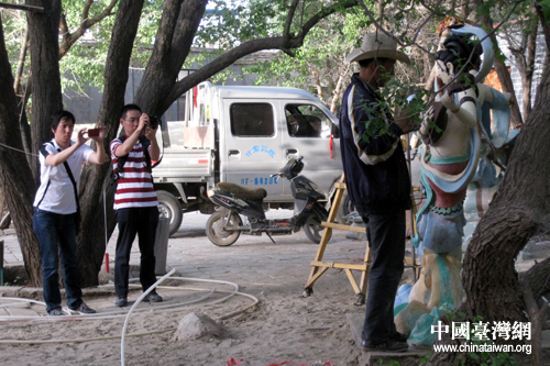 臺(tái)灣記者方勁松和藍(lán)孝威拍攝工人給飛天雕像涂色的畫(huà)面。(中國(guó)臺(tái)灣網(wǎng) 郜利敏 攝)