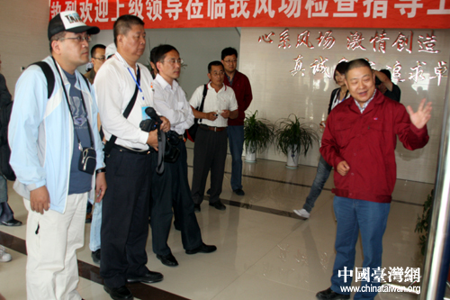 中國水電顧問集團總經(jīng)理陳登平向兩岸媒體記者詳細介紹了瓜州縣新能源發(fā)展和風電機組運行以及風能輸送方式等情況。(中國臺灣網(wǎng) 郜利敏 攝)