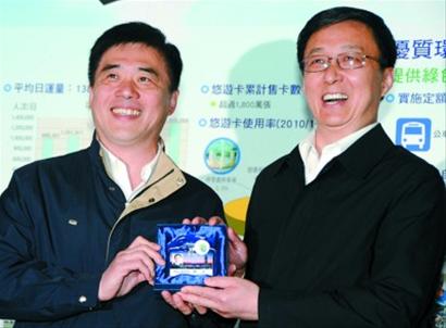 圖片說明:4月7日,臺北市長郝龍斌(左)向來訪的上海市長韓正贈送乘坐臺北捷運(yùn)使用的電子車票悠游卡。