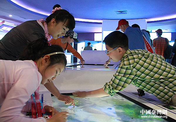 臺北館內(nèi),孩子們通過觸摸屏體驗,讓淡水河在自己手中變得清澈(中國臺灣網(wǎng) 鐘寶華 攝)