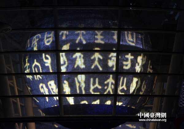 臺(tái)灣館點(diǎn)燈祈福儀式現(xiàn)場(chǎng),720度球幕上“綻放焰火”慶祝。(中國(guó)臺(tái)灣網(wǎng) 鐘寶華 攝)