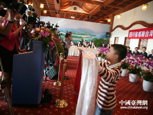 抗災(zāi)救災(zāi)小英雄林浩為臺灣嘉賓和記者獻(xiàn)哈達(dá)。圖片來源:四川省臺辦