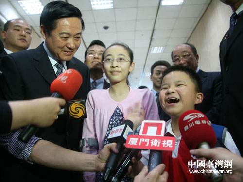 劉奇葆在機(jī)場為大家介紹來自四川地震災(zāi)區(qū)的小朋友林浩和李月。圖片來源:四川省臺辦