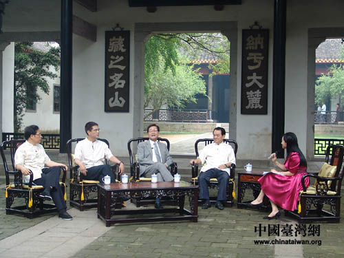 李厚業(yè)(左四)、臺(tái)灣名嘴葉耀鵬(左三)、長(zhǎng)沙市臺(tái)協(xié)會(huì)長(zhǎng)鄭聰。ㄗ蠖┰谠缆磿(shū)院與書(shū)院院長(zhǎng)朱漢民(左一)座談。(攝影 董潔)
