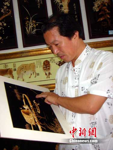 楊丙軍在整理蘆葦畫作品《池塘月色》。 作 者:石英杰