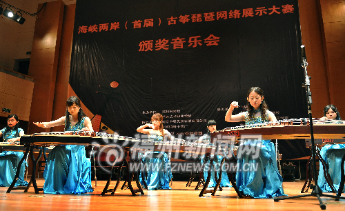 在9日晚的頒獎(jiǎng)音樂會(huì)上,兩岸優(yōu)秀古箏琵琶選手共同為觀眾獻(xiàn)上了古箏重奏《炎》,琵琶獨(dú)奏《火把節(jié)之夜》,古箏、琵琶重奏《美麗的草原我的家》等經(jīng)典曲目。(福州日?qǐng)?bào)記者 呂路陽(yáng)/文 黃立新/攝)