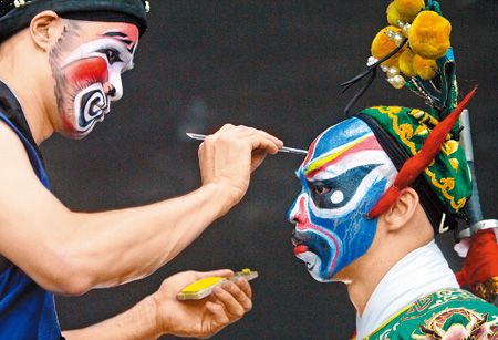 圖為開課前臺(tái)灣丑角演員林朝緒(左)幫師弟曾冠東(右)化妝。圖片來源:臺(tái)灣中國(guó)時(shí)報(bào)