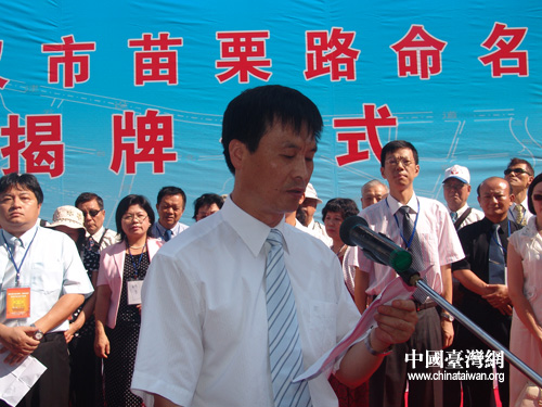 武漢市委副書記胡曙光、中國(guó)國(guó)民黨苗栗縣黨部訪問(wèn)團(tuán)領(lǐng)隊(duì)江村貴為苗栗路揭牌(攝影:陳寧)