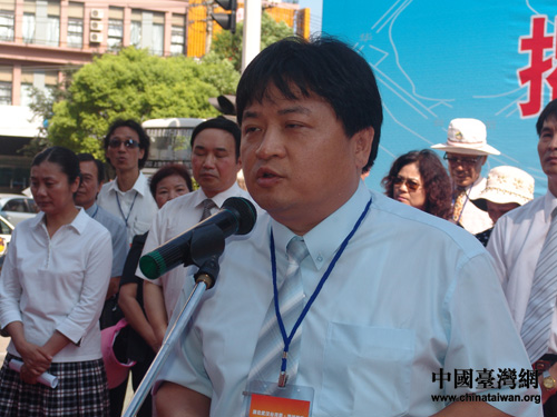 中國(guó)國(guó)民黨苗栗縣黨部訪問(wèn)團(tuán)領(lǐng)隊(duì)江村貴在揭牌儀式上致辭。(攝影:陳寧)