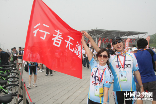 “行者無疆 綠色騎行”,兩名臺灣青年在活動中留影紀念。(中國臺灣網(wǎng) 于斯文 攝)