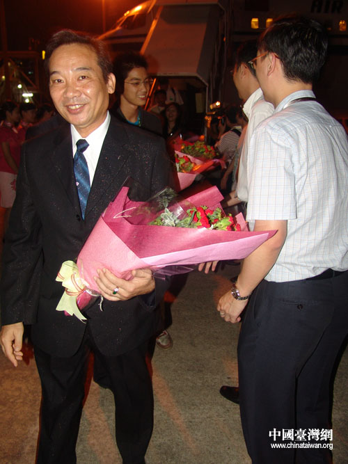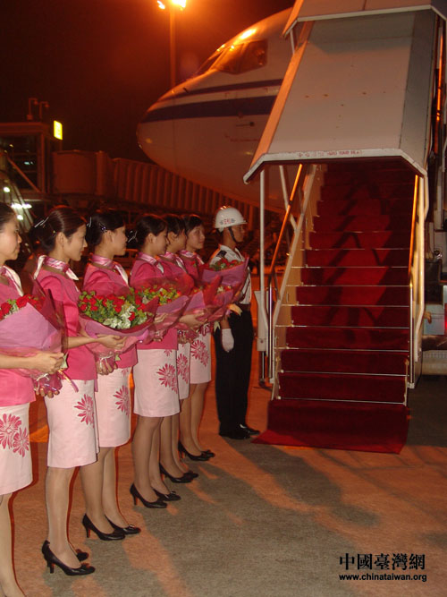 昨日19時45分,CA188次航班抵達廈門機場,機場內(nèi)準備了簡單歡迎儀式!盁崃覛g迎臺灣青年朋友參加首屆兩岸青年聯(lián)歡節(jié)”的橫幅醒目親切,樂隊奏響迎賓曲,禮儀小姐捧上鮮花,來機場接機的廈門市部分領(lǐng)導(dǎo)和國航方面負責人與臺灣客人握手并合影。